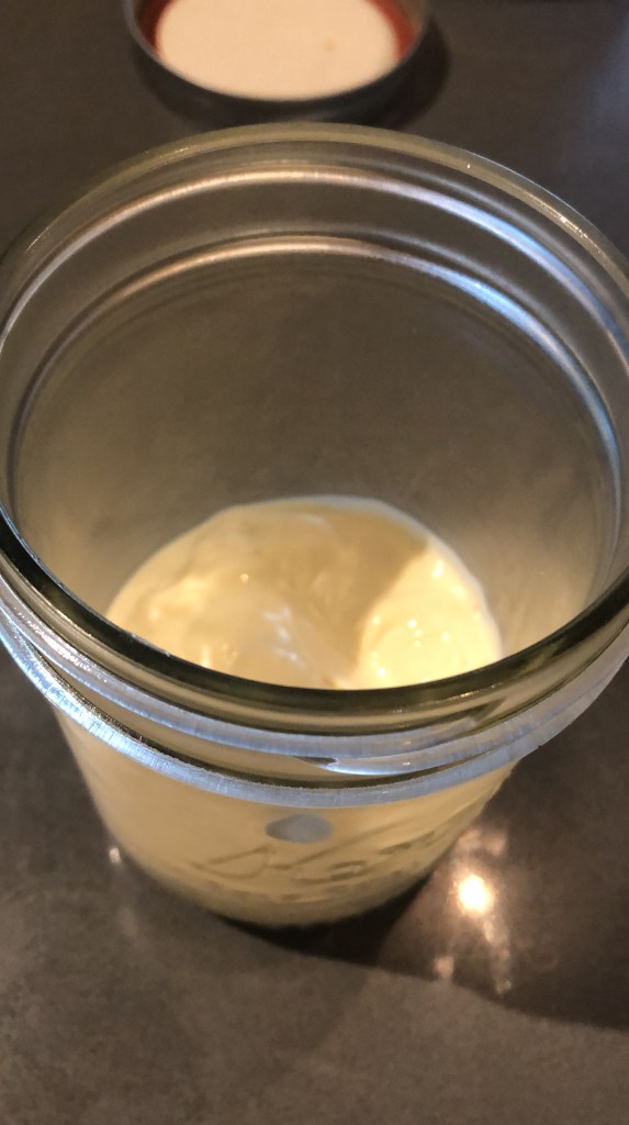 It turns out that avocado oil serves as a tasty, healthy fat substitute when making mayonnaise. The best avocado – and among the most pure – is Maryanne’s which you can find at Costco. You will also want to use an immersion blender for this recipe.