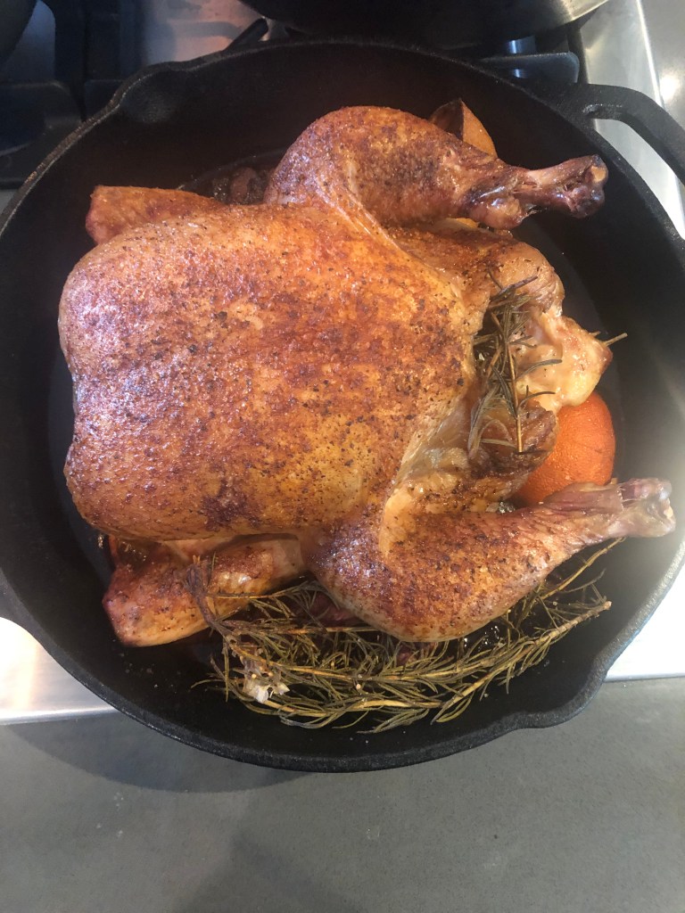 Preheat oven to 425 degrees with rack positioned in the center. Melt the butter in a small saucepan. Combine all of the spices. Rinse and pat dry the chicken with paper towels. Using a sharp knife, slice the chicken legs down through the thigh so that the legs rest splayed out. By doing this, the dark meat will cook with the same timing as the breast. Spread the root vegetables, onion, and garlic in a large iron skillet (15 inches). Place the chicken on top of the vegetable bed. Brush the butter all over the chicken. Then, sprinkle the spice mixture on the chicken as evenly as possible. You can leave the chicken cavity open and empty, or add a chopped citrus fruit inside. Either way, the cavity does not need to be sealed and tied.