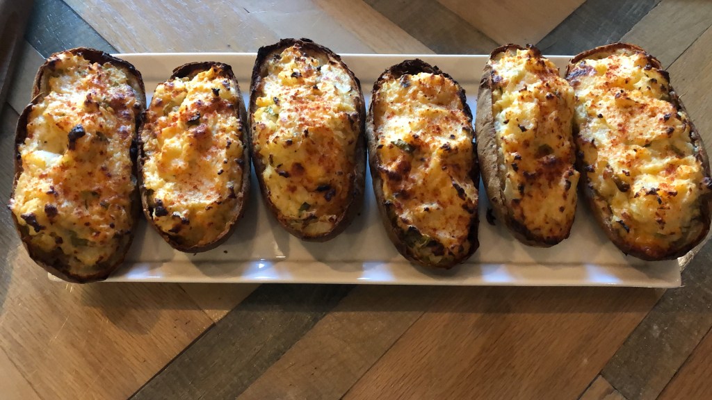 Potatoes have become a staple in our family, especially as my boys have become older. We have several potato recipes in the weekly rotation, most of which are simple to prepare. Twice baked is a surefire hit every time. This takes a while, about two hours, but the process is straightforward. This recipe is inspired by the approach used in America’s Test Kitchen cookbook. I like to accessorize the potatoes to complement the main course, which is usually a steak.